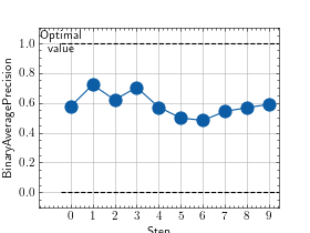 >>> # Example plotting multiple values >>> import torch >>> from torchmetrics.classification import BinaryAveragePrecision >>> metric = BinaryAveragePrecision() >>> values = [ ] >>> for _ in range(10): ... values.append(metric(torch.rand(20,), torch.randint(2, (20,)))) >>> fig_, ax_ = metric.plot(values)