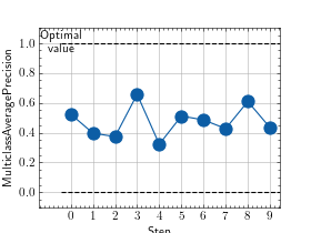 >>> # Example plotting multiple values >>> import torch >>> from torchmetrics.classification import MulticlassAveragePrecision >>> metric = MulticlassAveragePrecision(num_classes=3) >>> values = [ ] >>> for _ in range(10): ... values.append(metric(torch.randn(20, 3), torch.randint(3, (20,)))) >>> fig_, ax_ = metric.plot(values)