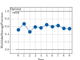 >>> # Example plotting multiple values >>> import torch >>> from torchmetrics.classification import MultilabelAveragePrecision >>> metric = MultilabelAveragePrecision(num_labels=3) >>> values = [ ] >>> for _ in range(10): ... values.append(metric(torch.rand(20,3), torch.randint(2, (20,3)))) >>> fig_, ax_ = metric.plot(values)