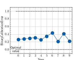 \[\text{ECE} = \sum_i^N b_i \|(p_i - c_i)\|, \text{L1 norm (Expected Calibration Error)}\]\[\text{MCE} = \max_{i} (p_i - c_i), \text{Infinity norm (Maximum Calibration Error)}\]\[\text{RMSCE} = \sqrt{\sum_i^N b_i(p_i - c_i)^2}, \text{L2 norm (Root Mean Square Calibration Error)}\]Where \(p_i\) is the top-1 prediction accuracy in bin \(i\), \(c_i\) is the average confidence of predictions in bin \(i\), and \(b_i\) is the fraction of data points in bin \(i\). Bins are constructed in an uniform way in the [0,1] range.
