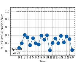 >>> from torch import randn, randint >>> # Example plotting a multiple values >>> from torchmetrics.classification import MulticlassCalibrationError >>> metric = MulticlassCalibrationError(num_classes=3, n_bins=3, norm='l1') >>> values = [] >>> for _ in range(20): ... values.append(metric(randn(20,3).softmax(dim=-1), randint(3, (20,)))) >>> fig_, ax_ = metric.plot(values)