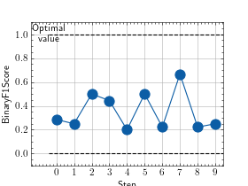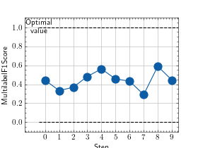 >>> from torch import rand, randint >>> # Example plotting multiple values >>> from torchmetrics.classification import BinaryF1Score >>> metric = BinaryF1Score() >>> values = [ ] >>> for _ in range(10): ... values.append(metric(rand(10), randint(2,(10,)))) >>> fig_, ax_ = metric.plot(values)