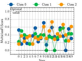 >>> from torch import rand, randint >>> # Example plotting multiple values >>> from torchmetrics.classification import MultilabelF1Score >>> metric = MultilabelF1Score(num_labels=3) >>> values = [ ] >>> for _ in range(10): ... values.append(metric(randint(2, (20, 3)), randint(2, (20, 3)))) >>> fig_, ax_ = metric.plot(values)