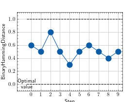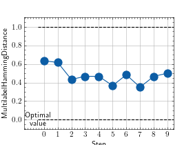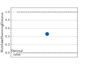 \[\text{Hamming distance} = \frac{1}{N \cdot L} \sum_i^N \sum_l^L 1(y_{il} \neq \hat{y}_{il})\]Where \(y\) is a tensor of target values, \(\hat{y}\) is a tensor of predictions, and \(\bullet_{il}\) refers to the \(l\)-th label of the \(i\)-th sample of that tensor.