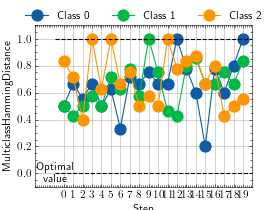>>> # Example plotting multiple values >>> from torch import rand, randint >>> from torchmetrics.classification import MultilabelHammingDistance >>> metric = MultilabelHammingDistance(num_labels=3) >>> values = [ ] >>> for _ in range(10): ... values.append(metric(randint(2, (20, 3)), randint(2, (20, 3)))) >>> fig_, ax_ = metric.plot(values)