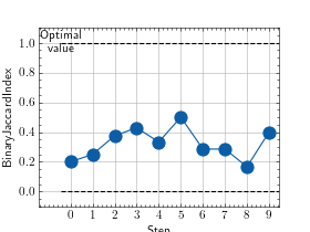 >>> # Example plotting multiple values >>> from torch import rand, randint >>> from torchmetrics.classification import BinaryJaccardIndex >>> metric = BinaryJaccardIndex() >>> values = [ ] >>> for _ in range(10): ... values.append(metric(rand(10), randint(2,(10,)))) >>> fig_, ax_ = metric.plot(values)