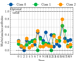 >>> # Example plotting a multiple values per class >>> from torch import randint >>> from torchmetrics.classification import MulticlassJaccardIndex >>> metric = MulticlassJaccardIndex(num_classes=3, average=None) >>> values = [] >>> for _ in range(20): ... values.append(metric(randint(3, (20,)), randint(3, (20,)))) >>> fig_, ax_ = metric.plot(values)