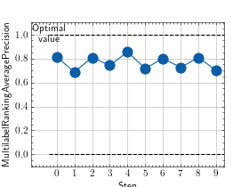 >>> from torch import rand, randint >>> # Example plotting multiple values >>> from torchmetrics.classification import MultilabelRankingAveragePrecision >>> metric = MultilabelRankingAveragePrecision(num_labels=3) >>> values = [ ] >>> for _ in range(10): ... values.append(metric(rand(20, 3), randint(2, (20, 3)))) >>> fig_, ax_ = metric.plot(values)