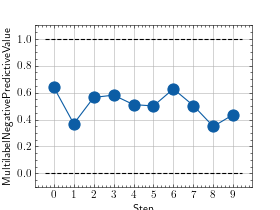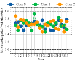 >>> from torch import rand, randint >>> # Example plotting multiple values >>> from torchmetrics.classification import MultilabelNegativePredictiveValue >>> metric = MultilabelNegativePredictiveValue(num_labels=3) >>> values = [ ] >>> for _ in range(10): ... values.append(metric(randint(2, (20, 3)), randint(2, (20, 3)))) >>> fig_, ax_ = metric.plot(values)