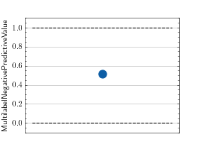 \[\text{Negative Predictive Value} = \frac{\text{TN}}{\text{TN} + \text{FN}}\]Where \(\text{TN}\) and \(\text{FN}\) represent the number of true negatives and false negatives respectively. The metric is only proper defined when \(\text{TN} + \text{FN} \neq 0\). If this case is encountered for any label, the metric for that label will be set to 0 and the overall metric may therefore be affected in turn.