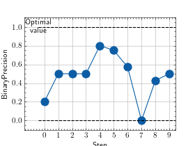 >>> from torch import rand, randint >>> # Example plotting multiple values >>> from torchmetrics.classification import BinaryPrecision >>> metric = BinaryPrecision() >>> values = [ ] >>> for _ in range(10): ... values.append(metric(rand(10), randint(2,(10,)))) >>> fig_, ax_ = metric.plot(values)