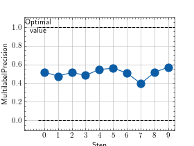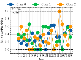 >>> from torch import rand, randint >>> # Example plotting multiple values >>> from torchmetrics.classification import MultilabelPrecision >>> metric = MultilabelPrecision(num_labels=3) >>> values = [ ] >>> for _ in range(10): ... values.append(metric(randint(2, (20, 3)), randint(2, (20, 3)))) >>> fig_, ax_ = metric.plot(values)