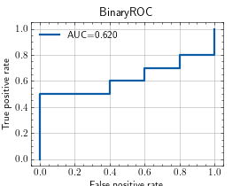 >>> from torch import tensor >>> from torchmetrics.classification import BinaryROC >>> preds = tensor([0, 0.5, 0.7, 0.8]) >>> target = tensor([0, 1, 1, 0]) >>> metric = BinaryROC(thresholds=None) >>> metric(preds, target) (tensor([0.0000, 0.5000, 0.5000, 0.5000, 1.0000]), tensor([0.0000, 0.0000, 0.5000, 1.0000, 1.0000]), tensor([1.0000, 0.8000, 0.7000, 0.5000, 0.0000])) >>> broc = BinaryROC(thresholds=5) >>> broc(preds, target) (tensor([0.0000, 0.5000, 0.5000, 0.5000, 1.0000]), tensor([0., 0., 1., 1., 1.]), tensor([1.0000, 0.7500, 0.5000, 0.2500, 0.0000]))