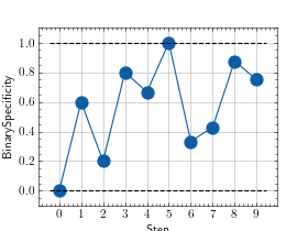 >>> from torch import rand, randint >>> # Example plotting multiple values >>> from torchmetrics.classification import BinarySpecificity >>> metric = BinarySpecificity() >>> values = [ ] >>> for _ in range(10): ... values.append(metric(rand(10), randint(2,(10,)))) >>> fig_, ax_ = metric.plot(values)