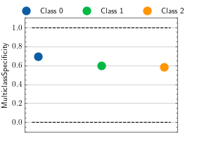 \[\text{Specificity} = \frac{\text{TN}}{\text{TN} + \text{FP}}\]Where \(\text{TN}\) and \(\text{FP}\) represent the number of true negatives and false positives respectively. The metric is only proper defined when \(\text{TN} + \text{FP} \neq 0\). If this case is encountered for any class, the metric for that class will be set to 0 and the overall metric may therefore be affected in turn.