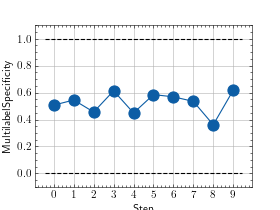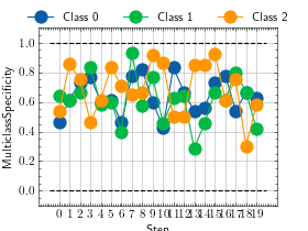 >>> from torch import rand, randint >>> # Example plotting multiple values >>> from torchmetrics.classification import MultilabelSpecificity >>> metric = MultilabelSpecificity(num_labels=3) >>> values = [ ] >>> for _ in range(10): ... values.append(metric(randint(2, (20, 3)), randint(2, (20, 3)))) >>> fig_, ax_ = metric.plot(values)