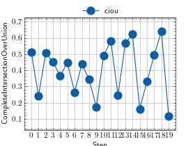 >>> # Example plotting multiple values >>> import torch >>> from torchmetrics.detection import CompleteIntersectionOverUnion >>> preds = [ ... { ... "boxes": torch.tensor([[296.55, 93.96, 314.97, 152.79], [298.55, 98.96, 314.97, 151.79]]), ... "scores": torch.tensor([0.236, 0.56]), ... "labels": torch.tensor([4, 5]), ... } ... ] >>> target = lambda : [ ... { ... "boxes": torch.tensor([[300.00, 100.00, 315.00, 150.00]]) + torch.randint(-10, 10, (1, 4)), ... "labels": torch.tensor([5]), ... } ... ] >>> metric = CompleteIntersectionOverUnion() >>> vals = [] >>> for _ in range(20): ... vals.append(metric(preds, target())) >>> fig_, ax_ = metric.plot(vals)